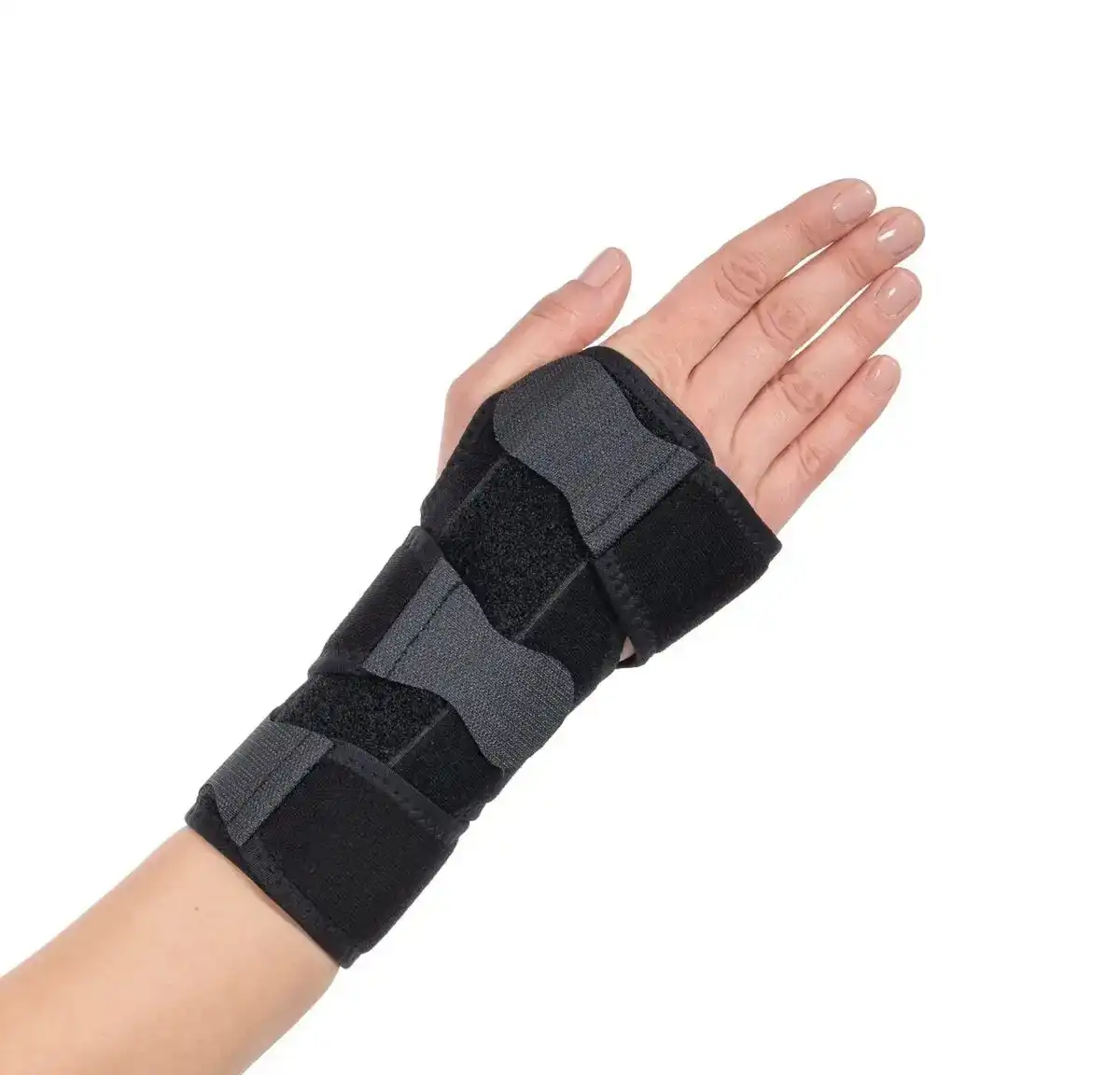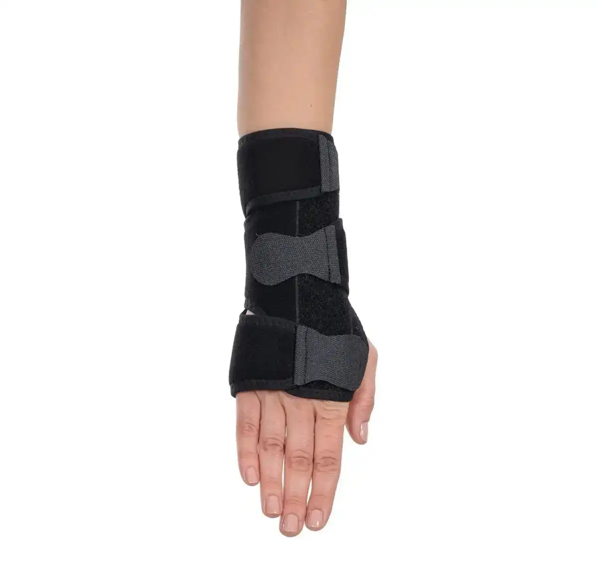 This splint features an anatomically shaped aluminum support that immobilizes the wrist in a neutral position. It includes a strap that enhances stabilization around the wrist. It comes in a standard size and can be personally adjusted with Velcro.