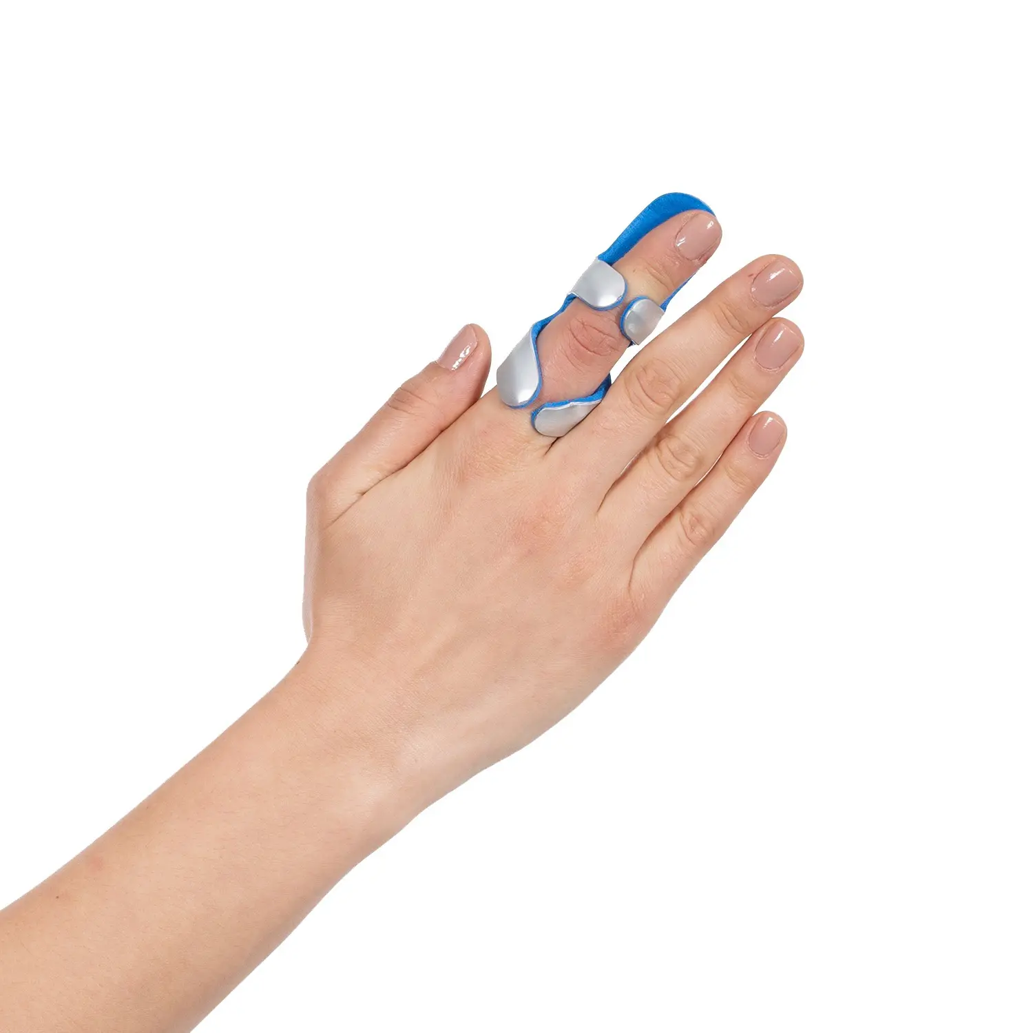 Cette une attelle de doigt en aluminium, dont la surface intérieure est recouverte de plastozote. Cette attelle assure l’immobilisation du doigt en extension.
